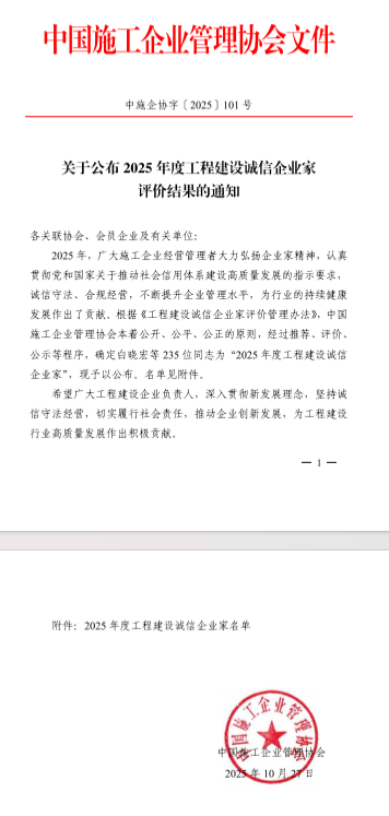 工程建设诚信典型企业评价工作是由中国施工企业管理协会组织开展,旨在增强工程建设行业自律意识,提高合规管理水平,推动行业信用建设高质量发展。本次获评,充分彰显了业界对公司长期以来坚持诚信经营、推动行业高质量发展的高度认可。