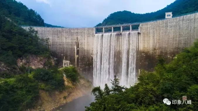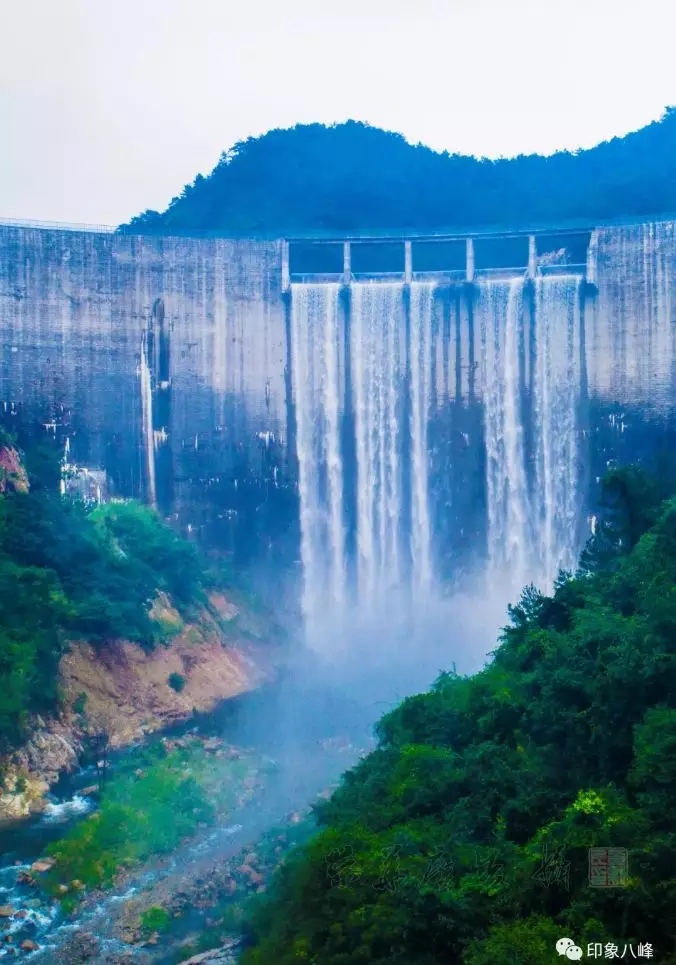受连日降雨影响,洛江八峰水库水位急剧上涨,至8月16日凌晨,水库蓄水至202米高程,库水经溢流口倾泻而下,在坝前形成一道美丽的瀑布。